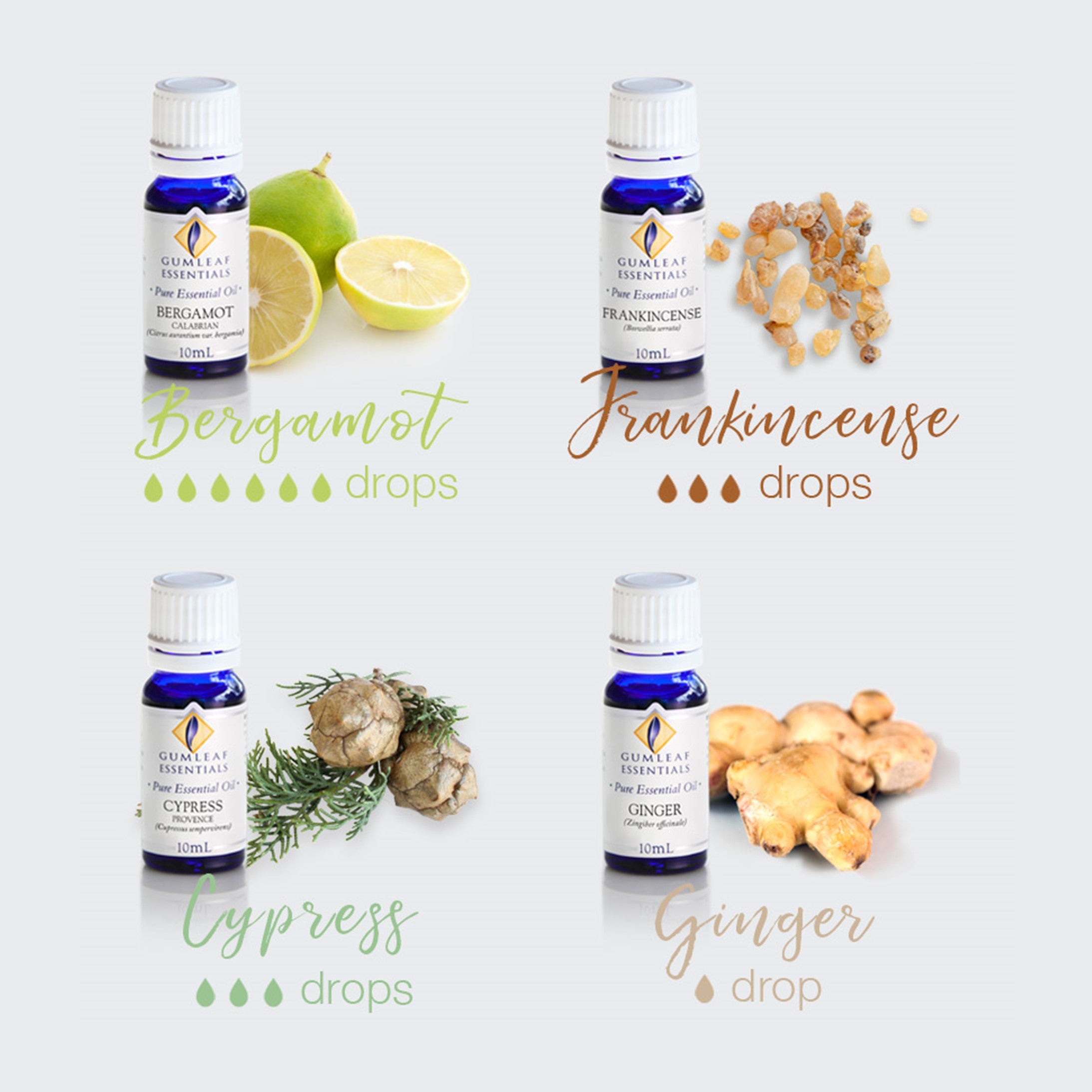 - Add essential oils of Bergamot, Frankincense, Cypress and Ginger to a diffuser, vaporizer or oil burner.