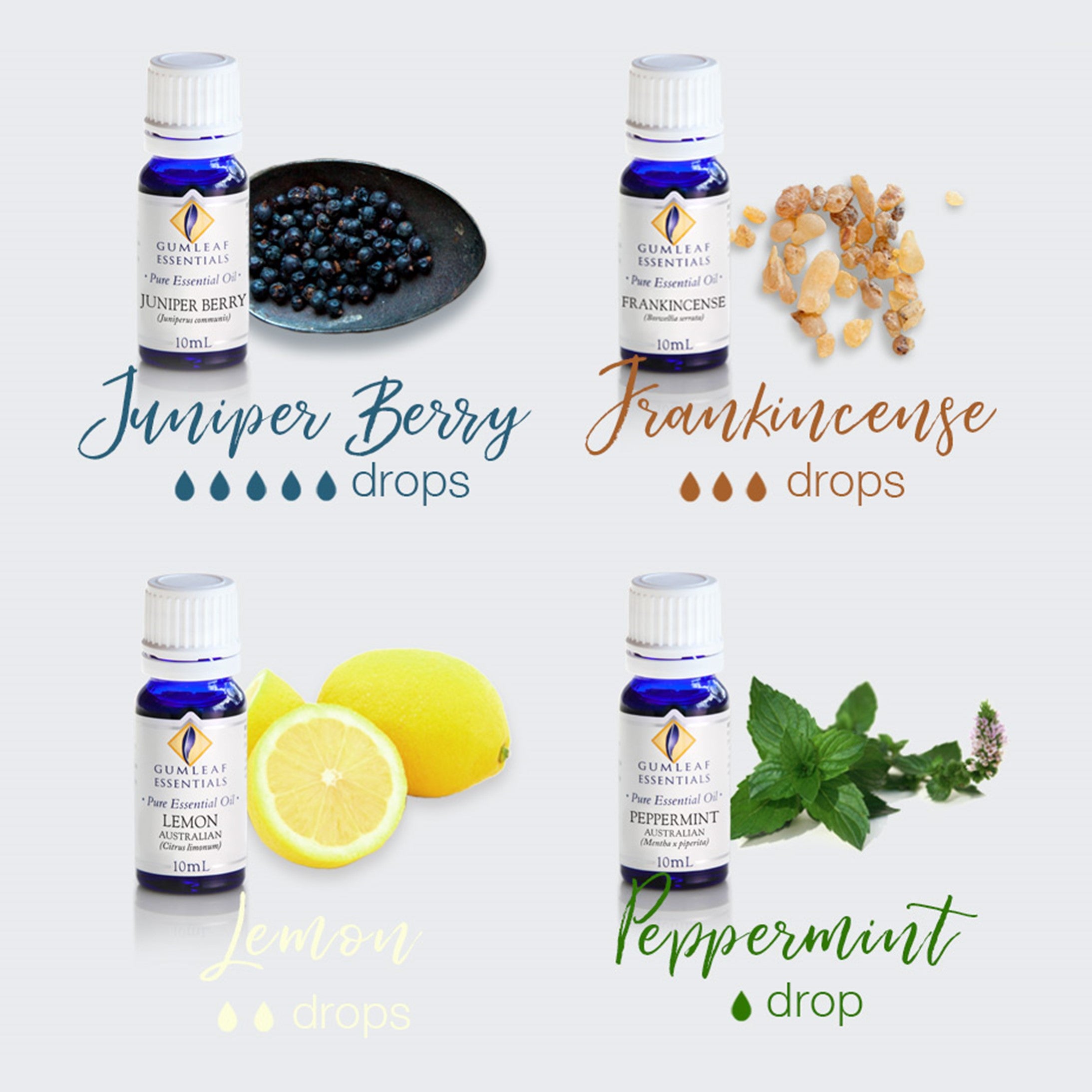 - Add essential oils of Juniper Berry, Frankincense, Lemon and Peppermint to a diffuser, vaporiser or oil burner.