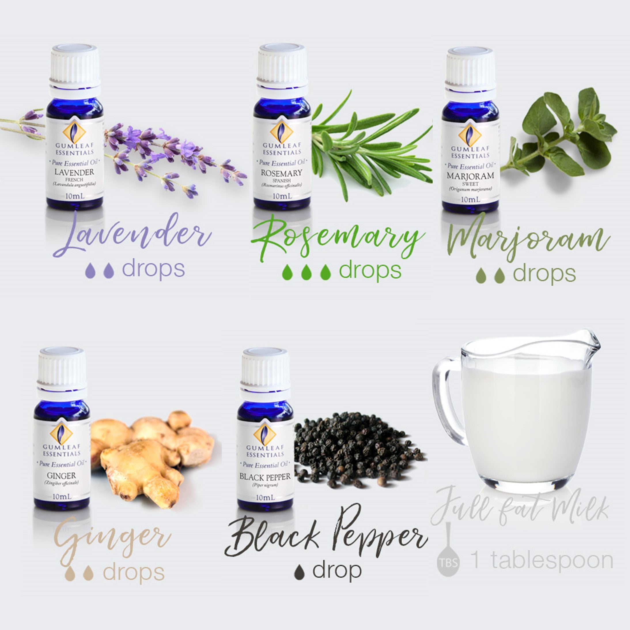 - Mix the essential oils of Rosemary, Lavender, Ginger, Marjoram and Black Pepper with 1 tablespoon of full fat milk then add to a warm bath.
