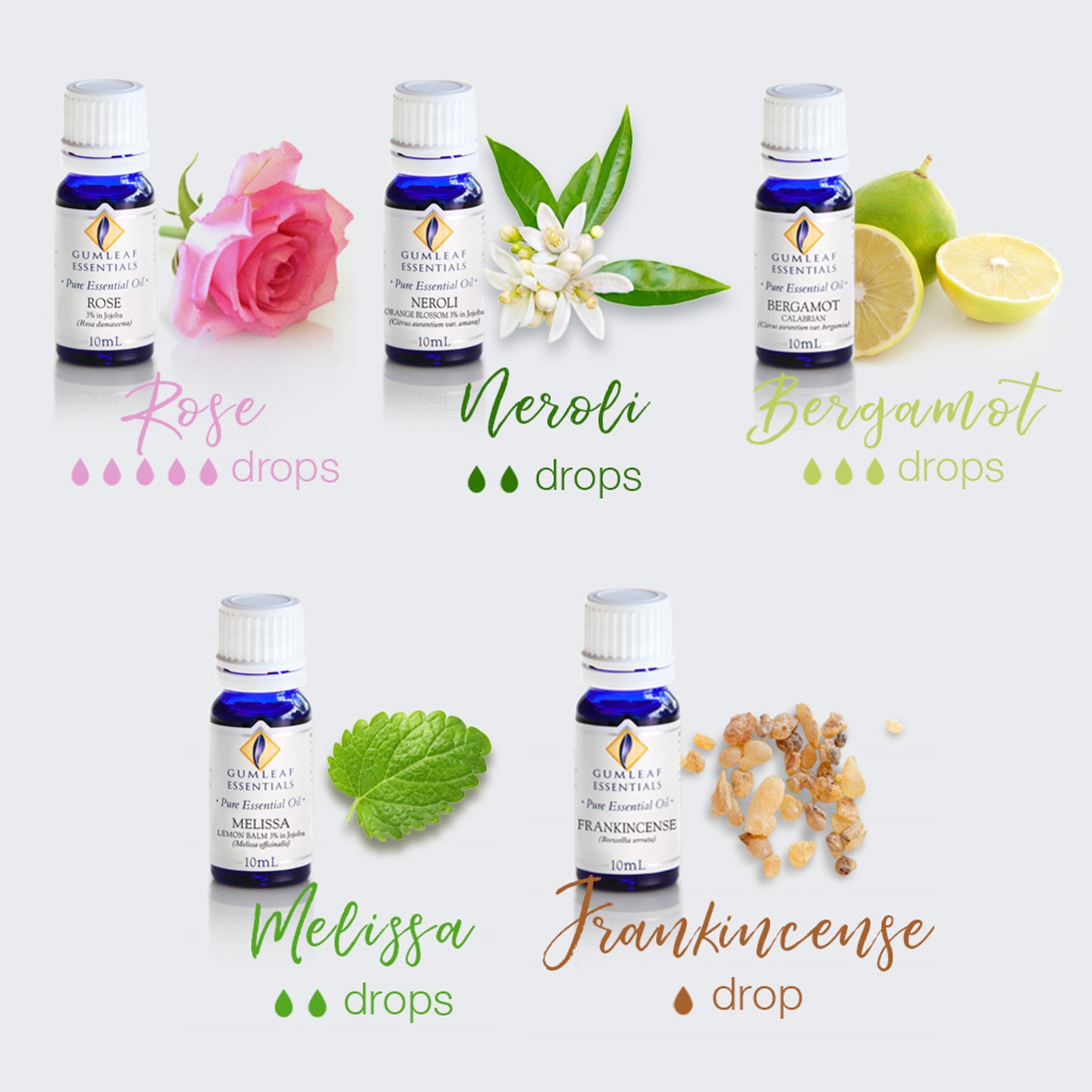 - Add the essential oils of Rose, Bergamot, Neroli, Melissa and Frankincense to a diffuser, vaporiser or oil burner.