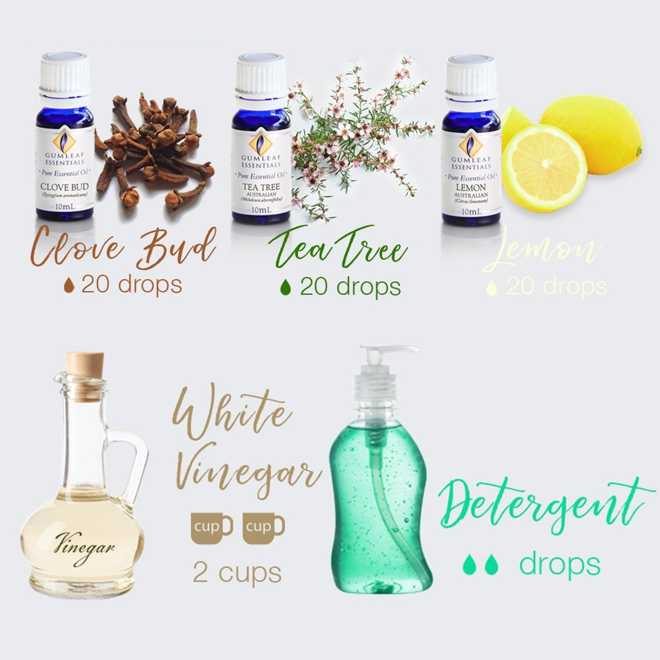 - Add vinegar, detergent and essential oils of Clove Bud, Lemon, and Tea Tree into an empty spray bottle. Screw on lid and shake well to mix.